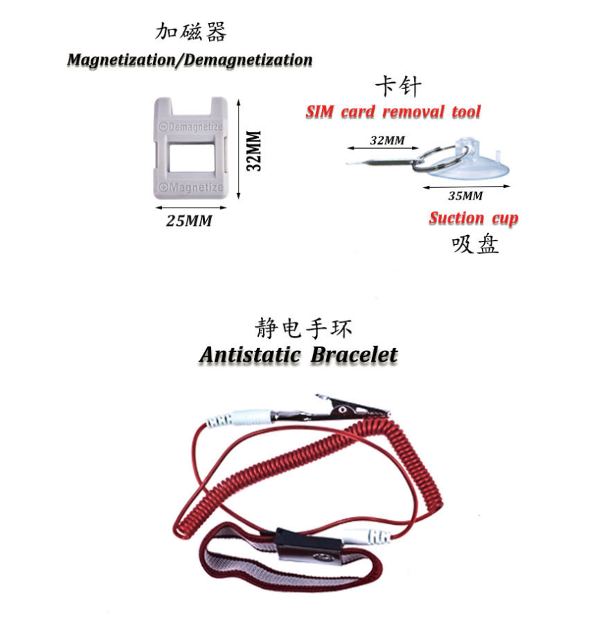 Annex: 60-in-1 screwdriver set*1,plastic crowbar*5,Black plastic crowbar*2,suction cup*1, SIM clip needle*1,anti-static wristband*1, Magnetization/Demagnetization*1,,metal ruler*1, metal crowbar*3, plastic,crowbar tool*1, stainless steel knife*1, stainless steel tweezers*3,cleaning brush*1