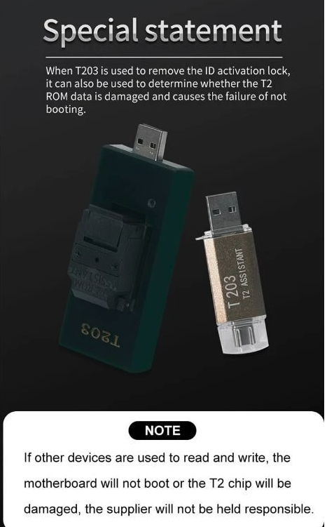 The data written inside T203 can only be used on T203 machines. If other equipment is used to read and write, the motherboard will not boot or the T2 chip will be damaged, the supplier will not take any responsibility.