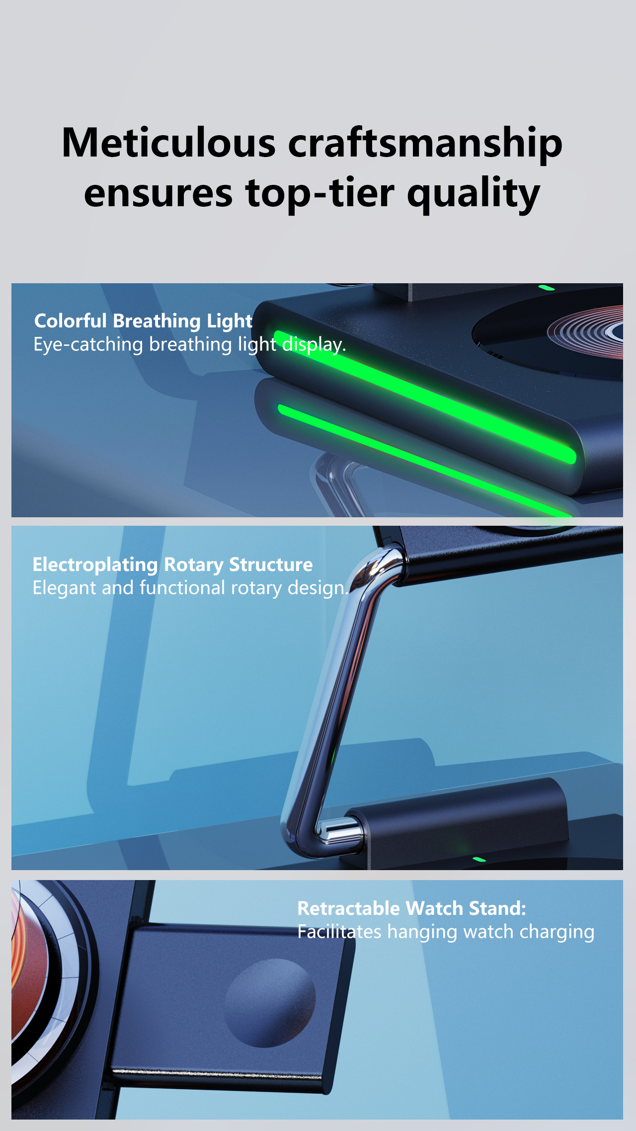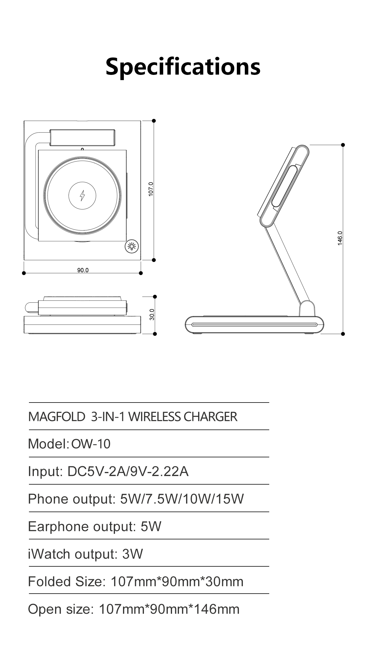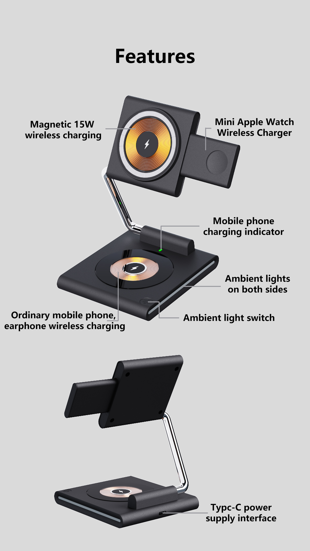 Foldable design with Qi standard wireless charging, compatible with both iPhone and Android phones;