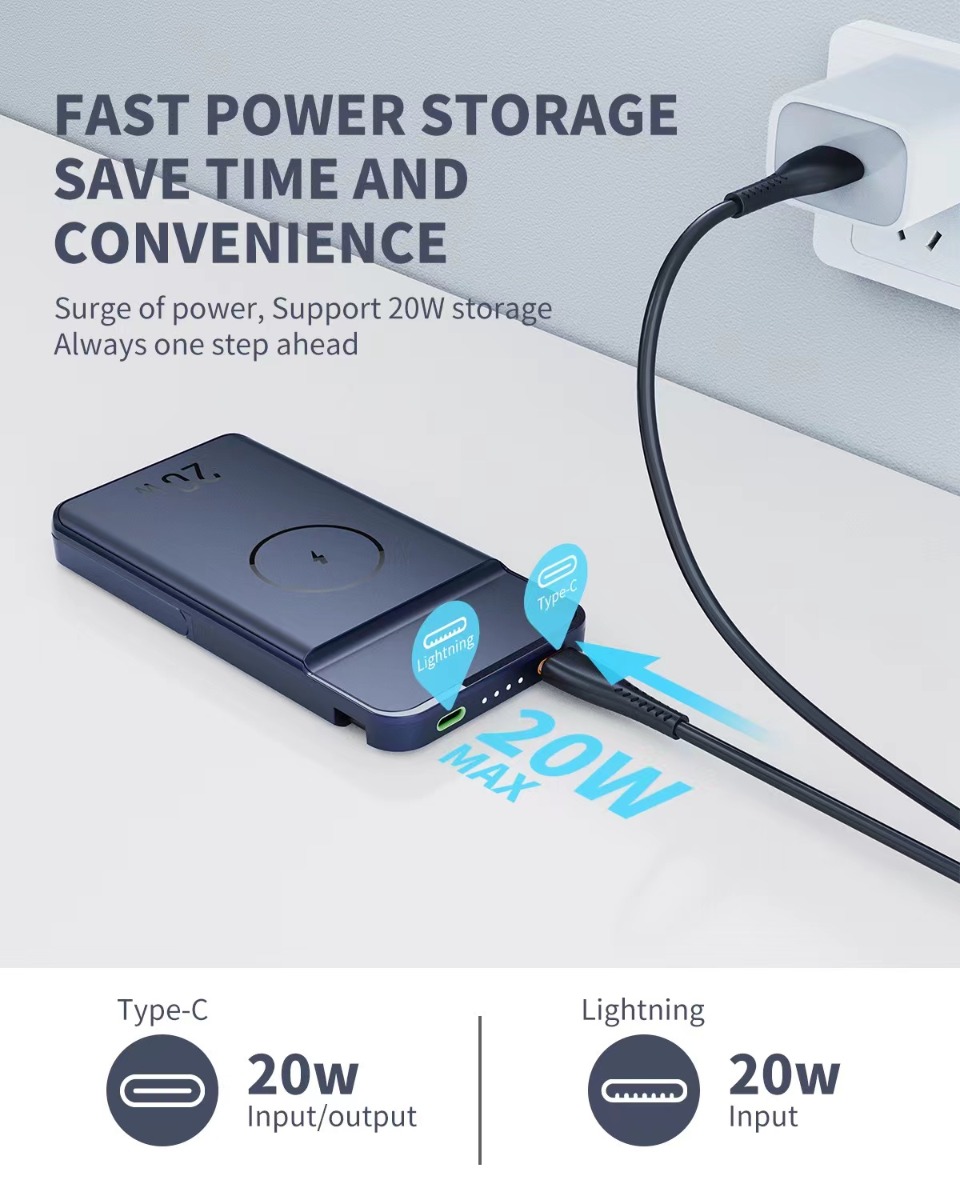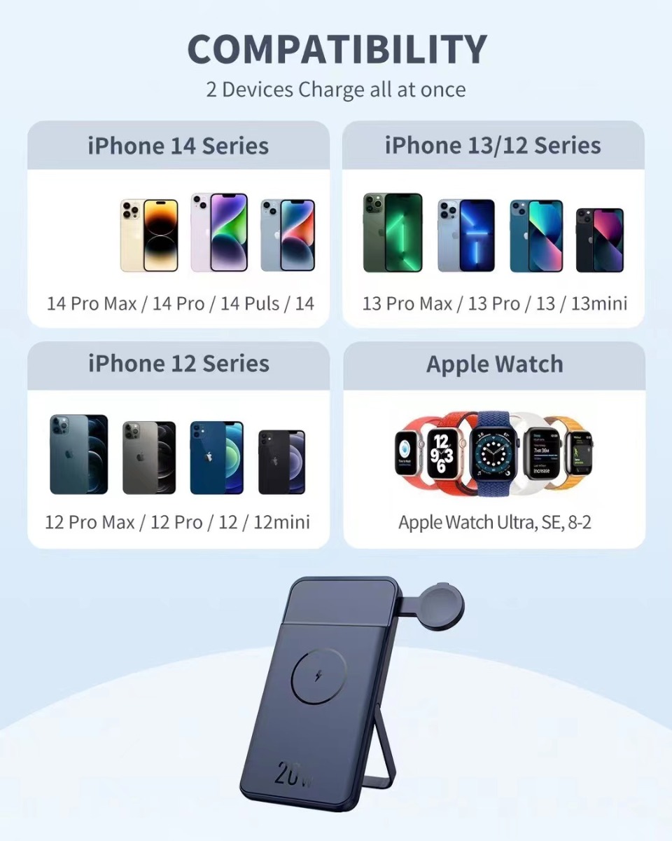 Features: 1. 2 in 1 design, support wireless charging of iPhone and Apple Watch simultaneously. 2. PD 20W quick charging, 7.5W for iPhone. 3. 10000mAh large capacity, can fully charge the iPhone 14 Pro twice. 4. Strong magnetic, secure portable charging. 5. Dual Charging Mode: Wired Charging Mode and Wireless Charging Mode. 6. Wireless Charging Flexibly: Can be charged Vertically/Horizontally. 7. Retractable Aluminum Alloy Stand design, suited for desk use. 8. Compatible with iPhone 14/13/12 series and Apple Watch Ultra/SE/8-2 series.