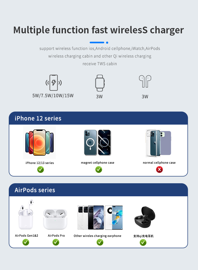 Qi standard wireless charging, compatible with both iPhone, Apple Watch, AirPods and Android phones;